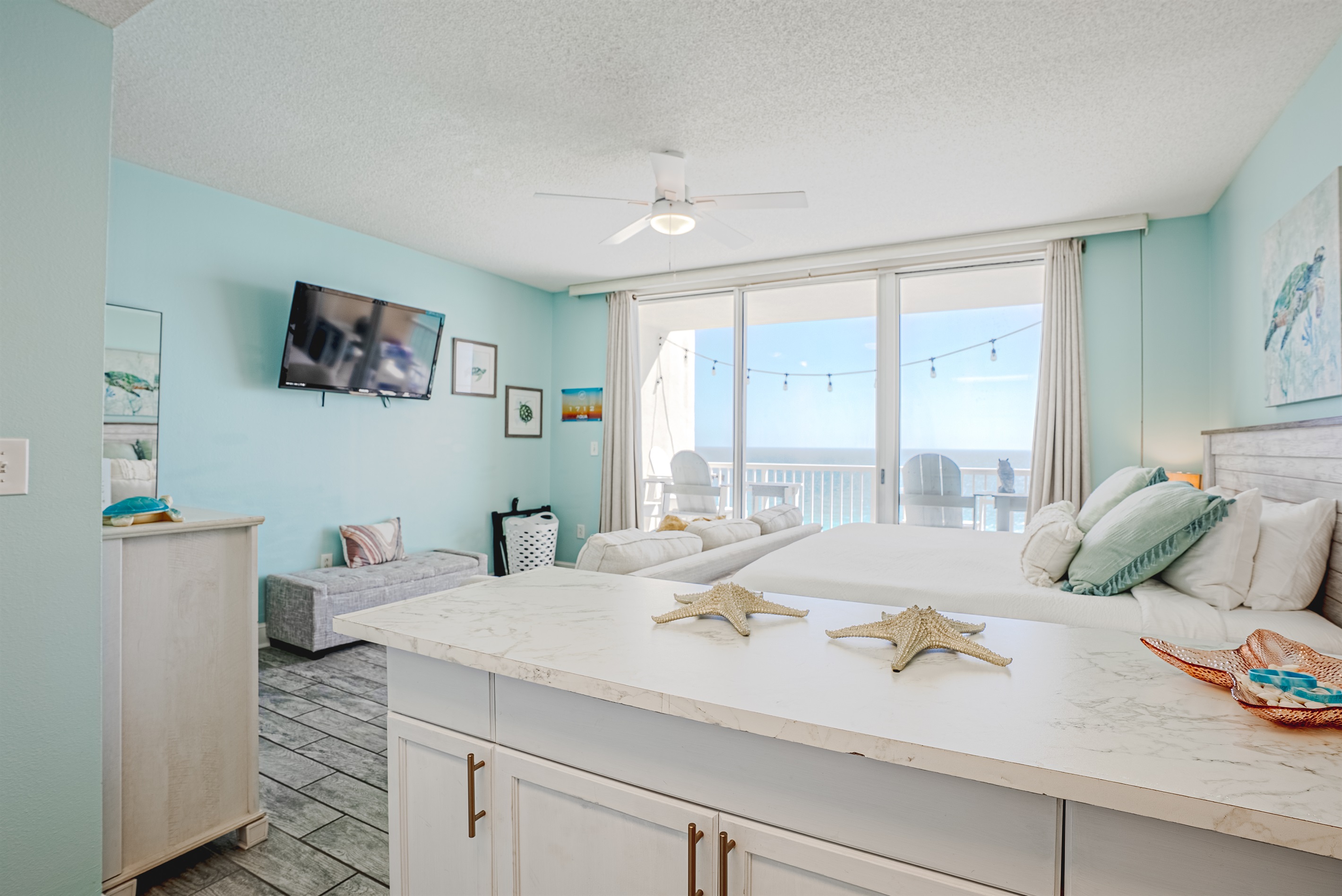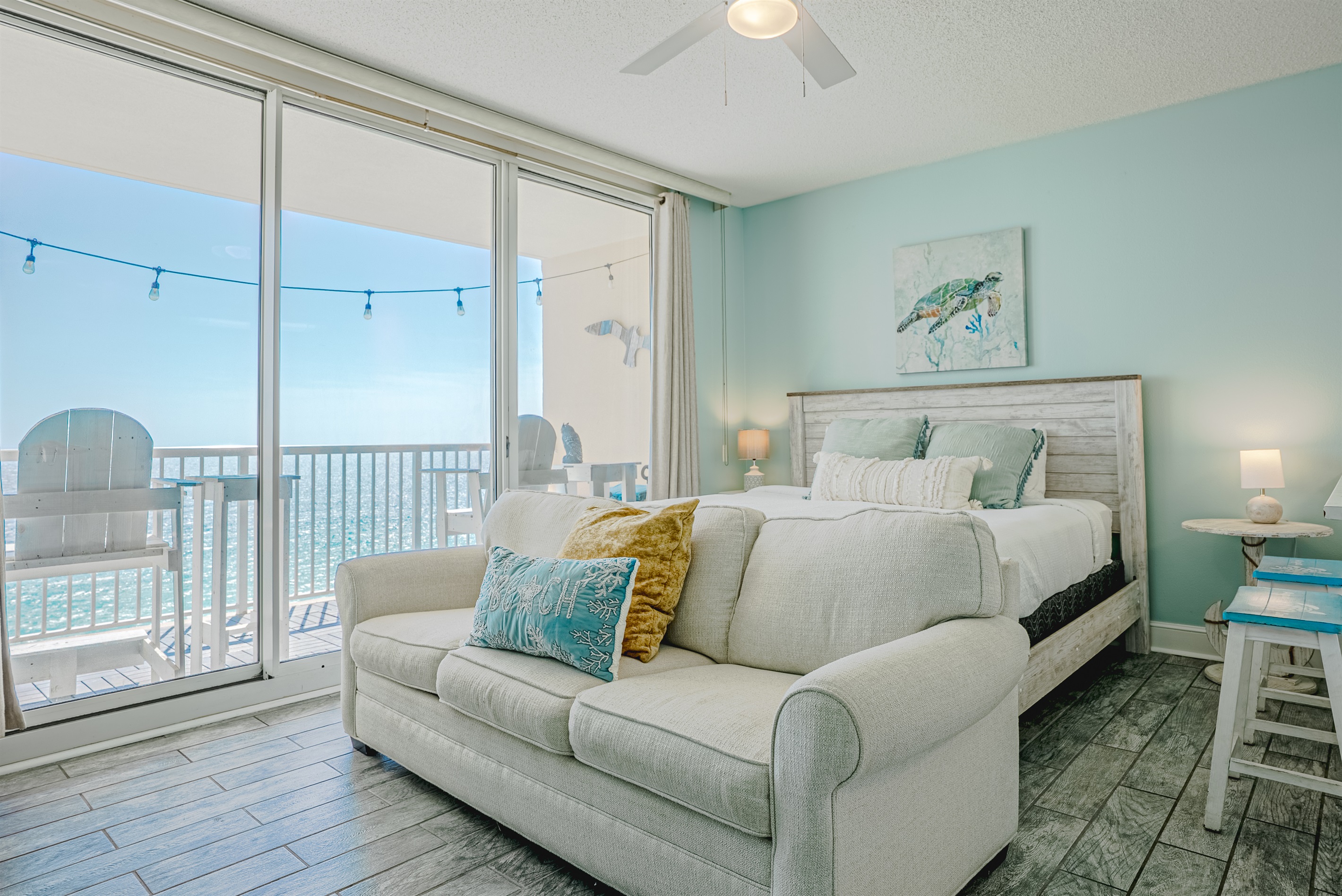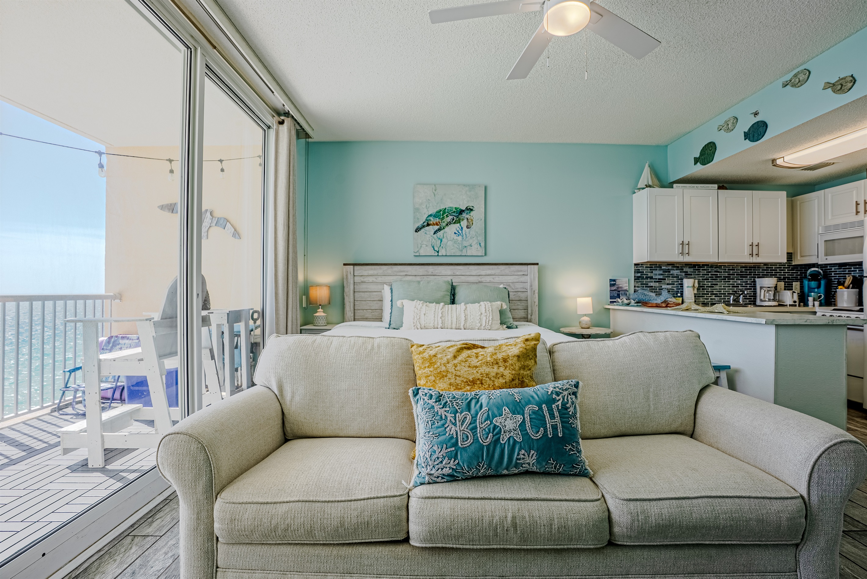 This Beachfront 2 bed studio is newly renovated and tastefully decorated. It has beautiful views of the white sandy beaches of the Emerald Coast. With your own large private balcony, you can enjoy the breath-taking sunsets in the evenings.