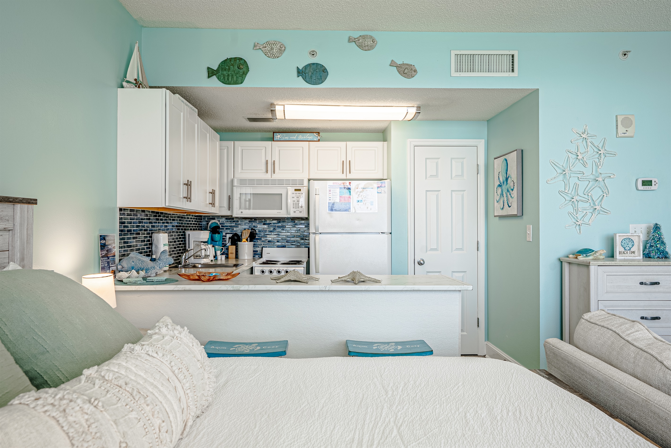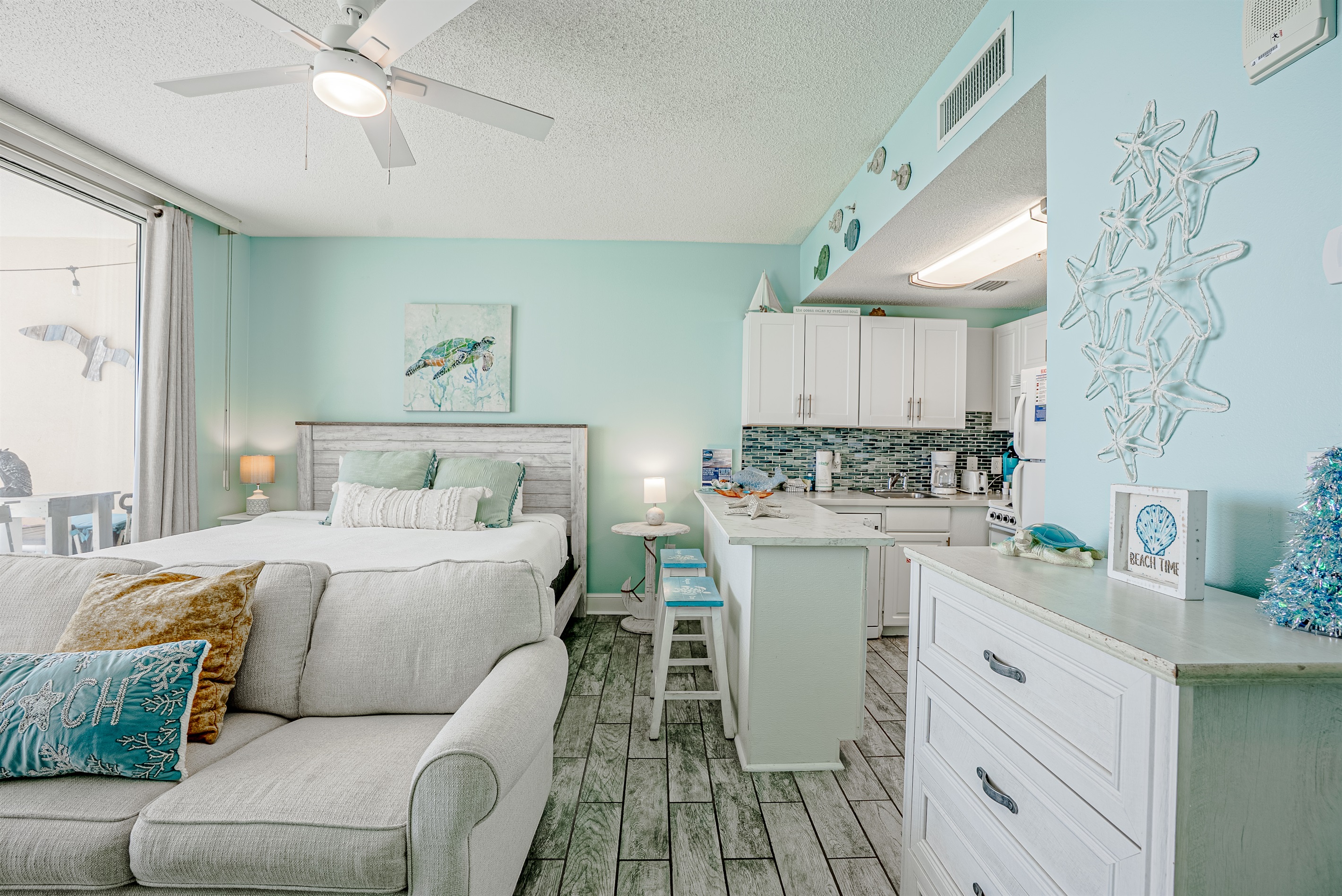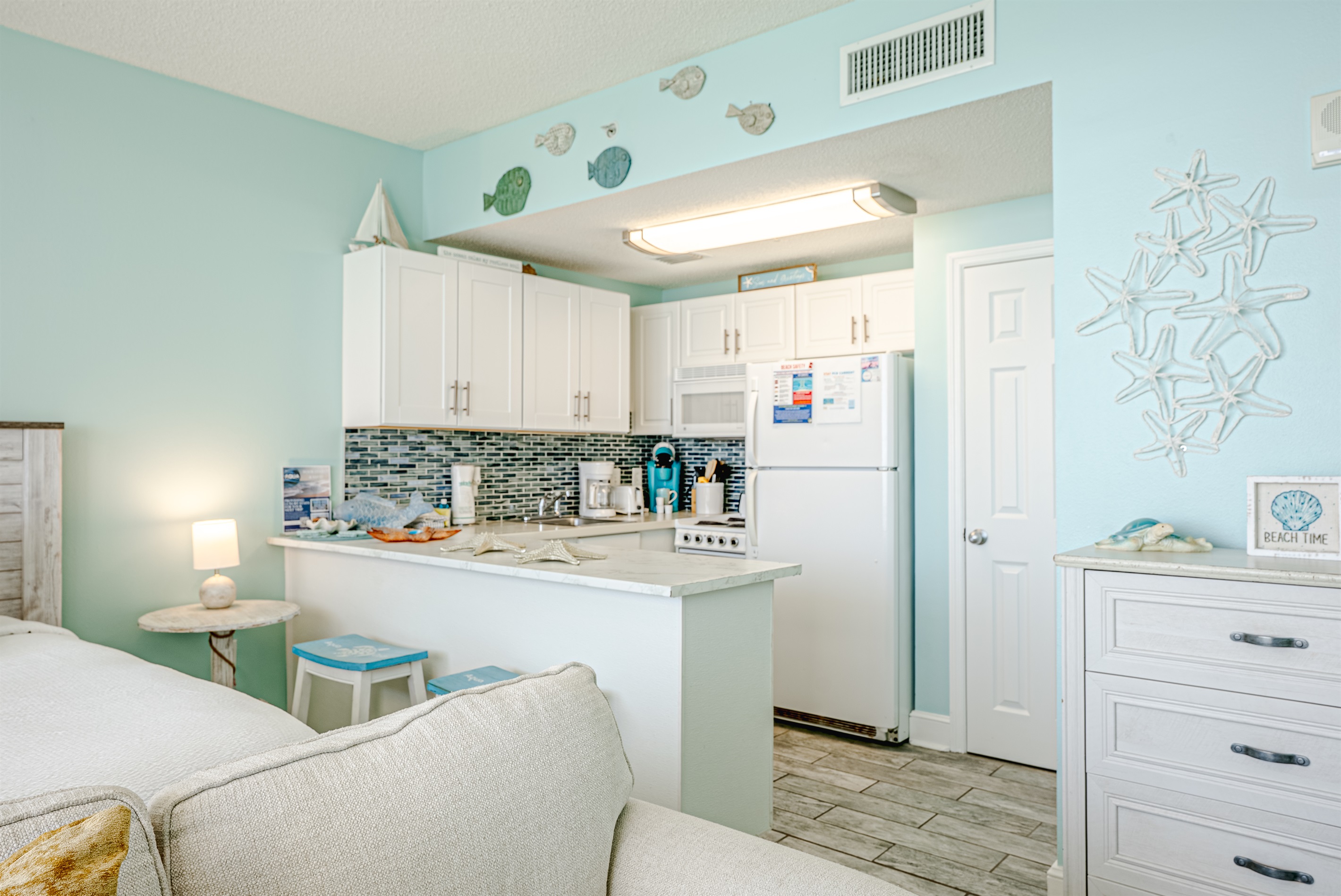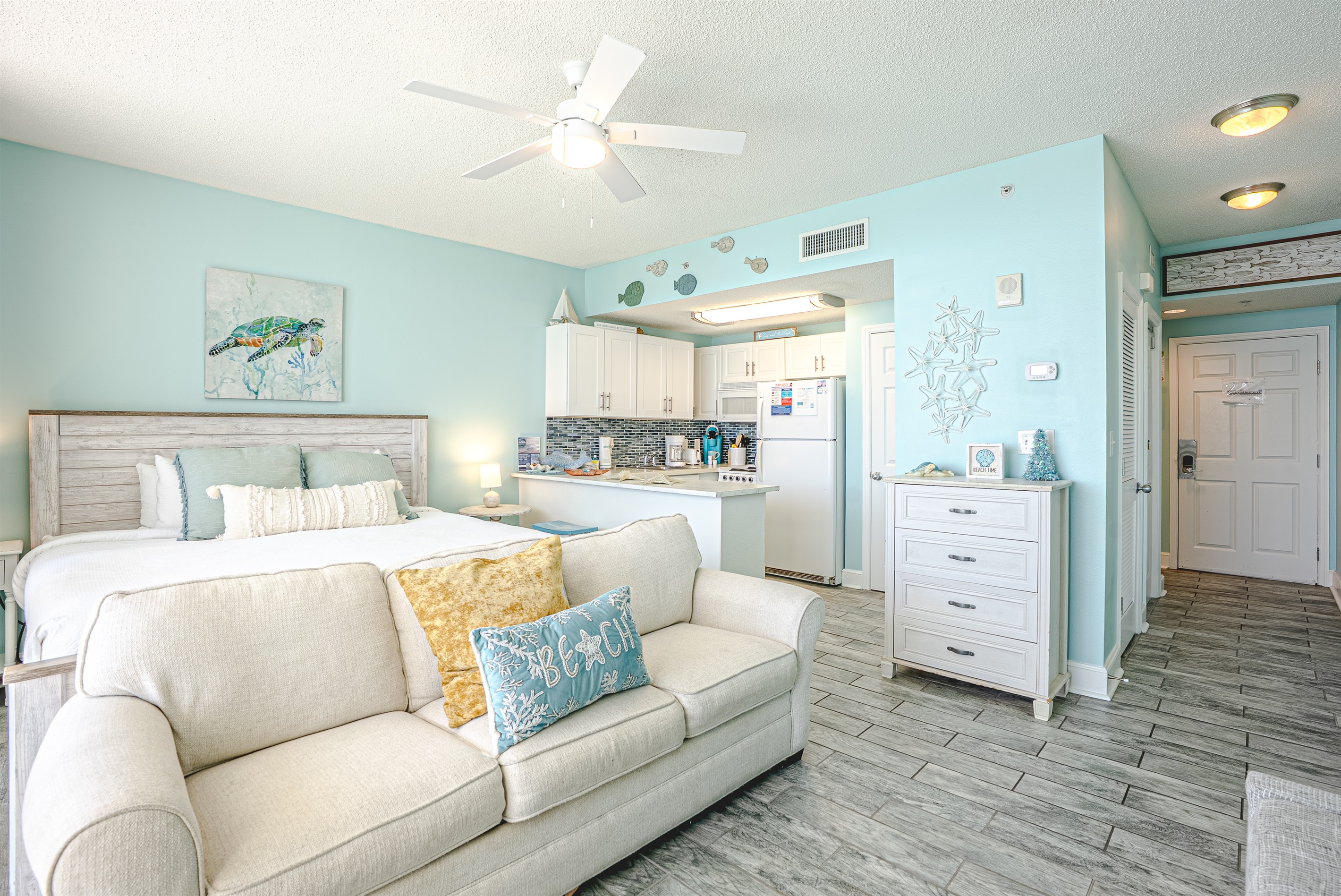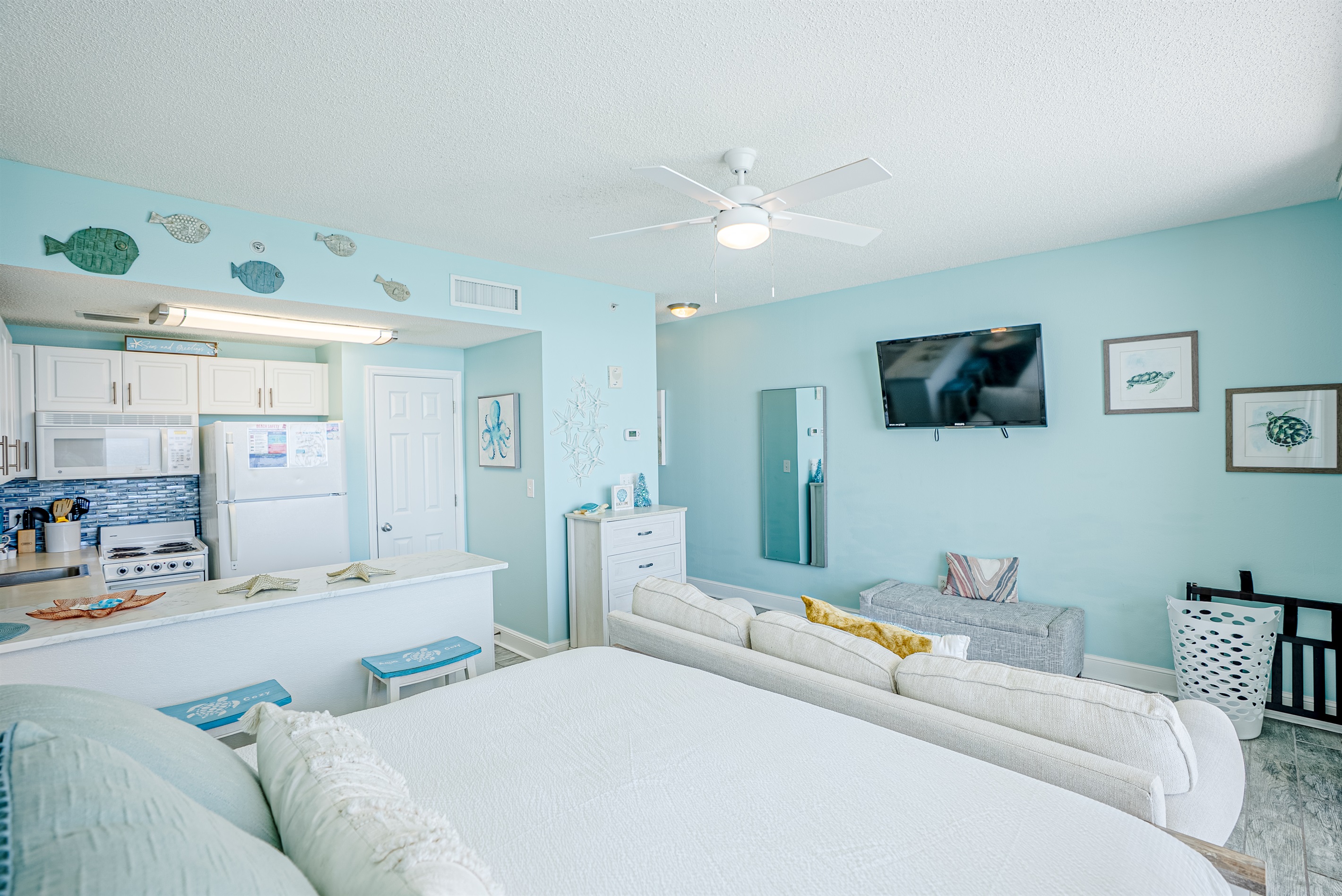 This studio condo has a new king bed & memory foam queen sleeper sofa. It is equipped with a fully-stocked kitchen, WIFI, jacuzzi tub & an amazon firestick for the convenience of a Smart TV. Make this condo the central spot of your trip, in walking distance to restaurants, attractions and more.